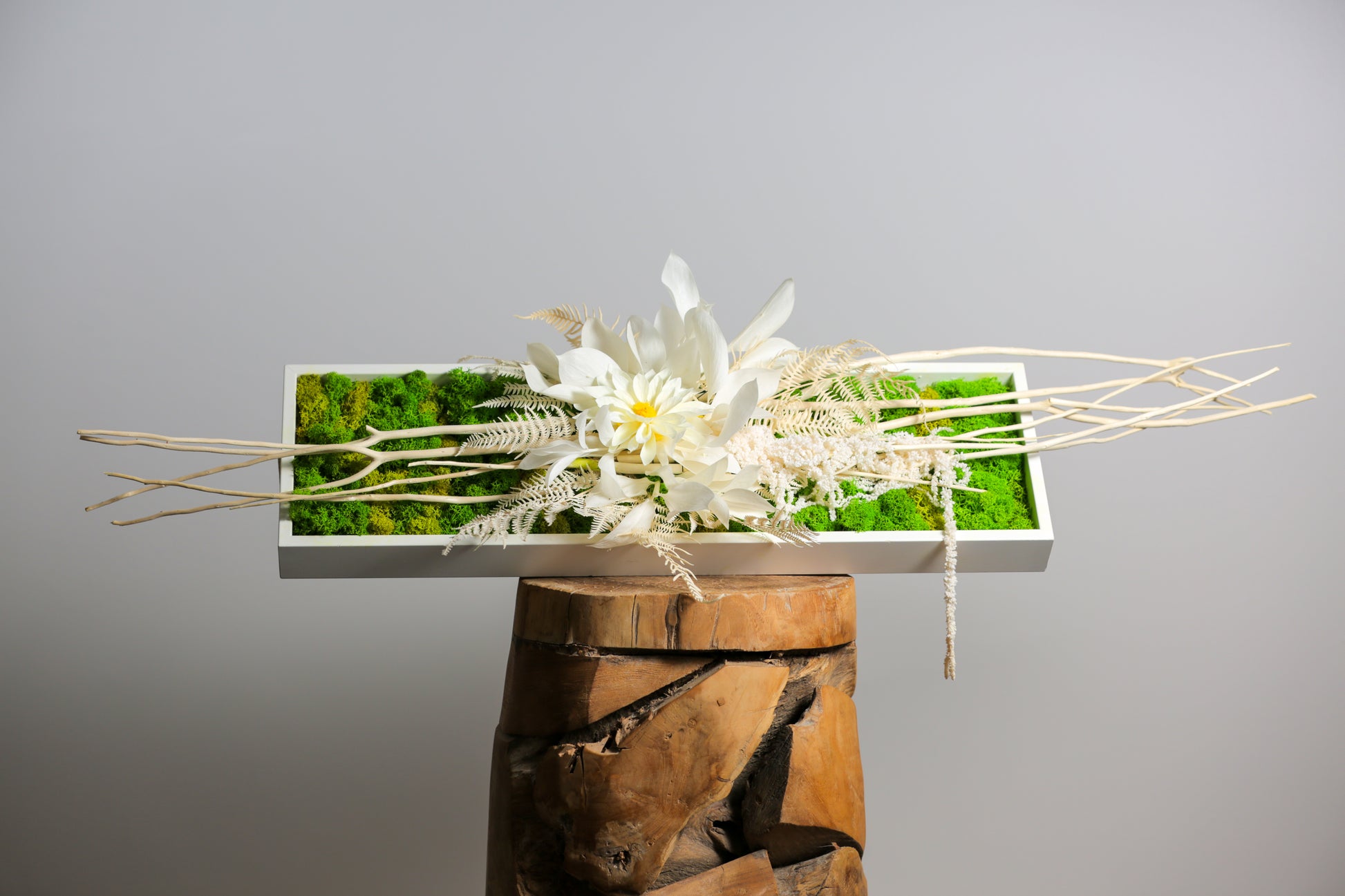 Rammen er fyldt med ægte præserveret mos i flere grønne nuancer, kombineret med præserverede blomster og delikate lyse botaniske elementer, som skaber et moderne og luftigt udtryk.